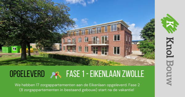 In Zwolle aan de Eikenlaan heeft Knol Bouw aan Wetland Wonen fase 1 opgeleverd: 17 nieuwbouw appartementen. De zorgappartementen zijn gebouwd achter het bestaande gebouw. Op een inbreidingslocatie grenzend aan een park, schoolplein en het bestaande gebouw.