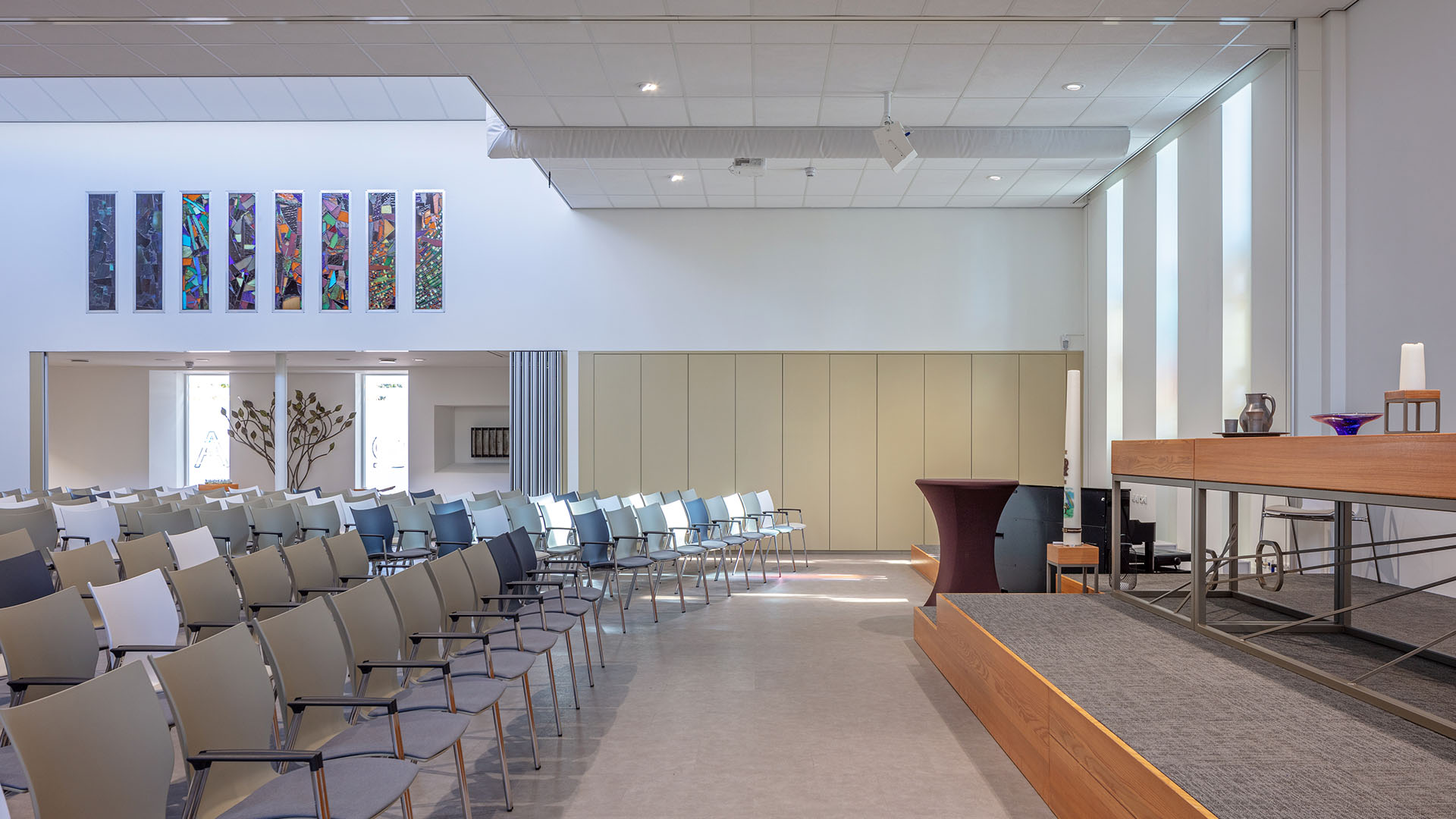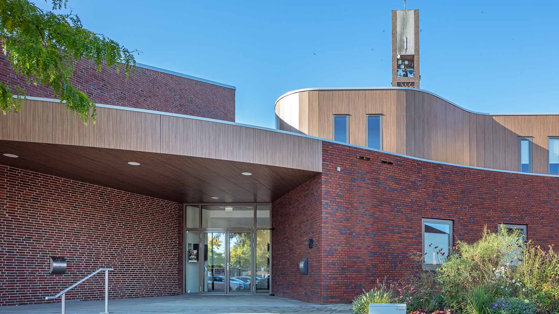 Tussen de sportzaal en de kerk komen algemene ruimtes voor verengingen en jeugdwerk, de nieuwe entree van de kerk is ook aan de parkeerterreinkant. De bestaande entree aan pleinzijde blijft behouden. Door de gebruikte vormentaal en de uitstraling zal de sfeer van karakteristieke gebouw behouden kunnen blijven.